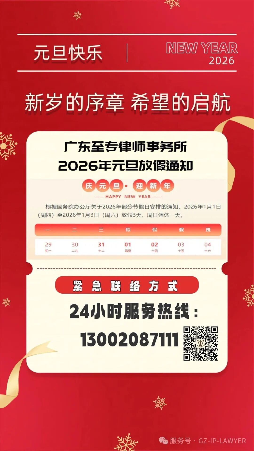 月更迭,华章日新。值此2026年元旦佳节来临之际,广东至专律师事务所全体同仁,向长期以来信任与支持我们的各位客户、合作伙伴及各界朋友,致以最诚挚的感谢和最美好的节日祝福!